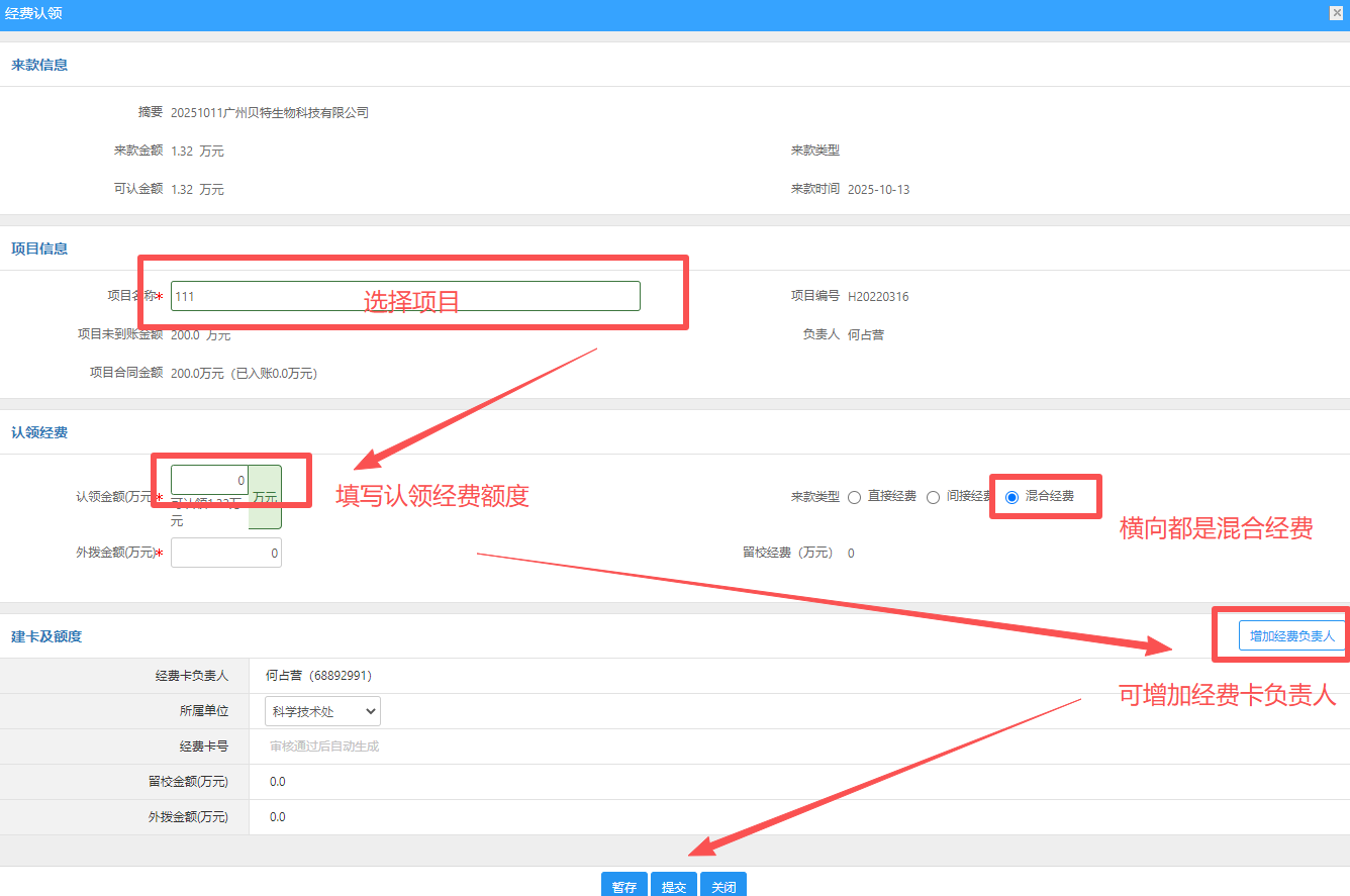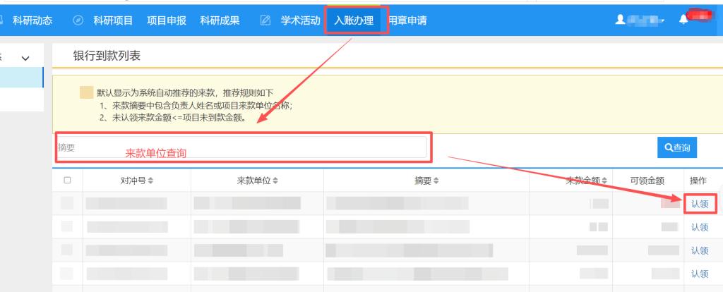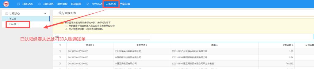 通过科研系统中的入账办理去认领经费,待审核通过后打印通知单交至财务处。
