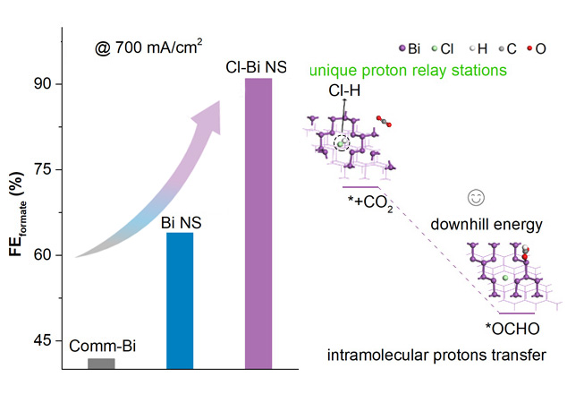 本文采用一种独特的快速低温策略制备了氯修饰的缺陷铋纳米片(Cl-Bi NS),并发现丰富的氯位点能够对ECR产生显著的质子供应效应。实验与理论计算结果共同表明,在催化过程中,铋纳米片缺陷位点上的氯离子能够形成Cl–H物种并充当质子中继站与缺陷铋位点协同作用,促进ECR过程中*OCHO中间体的形成。所得的氯修饰铋纳米片在100~700 mA/cm2范围内实现了超过90%的甲酸盐法拉第效率,其中在400 mA/cm2电流密度下实现了近100%的甲酸法拉第效率,并且甲酸盐的局部最高电流密度达636.8 mA/cm2,远优于未进行氯修饰的铋催化剂。此外,这种氯修饰的铋催化剂在以200 mA/cm2的电流密度持续电解130小时后仍表现出优异的稳定性。