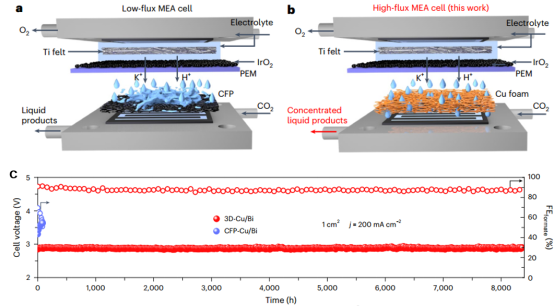 针对这一前沿问题,该研究提出来用高通量泡沫铜作为催化剂载体,利用其丰富且贯通的三维大孔道结构,为液体产物提供高效传质通道,强化产物从催化剂表面的快速脱附与定向转移,从而实现甲酸盐液体产物的高浓度、长时间连续制备。以Cu/Bi核壳纳米线作为催化剂,在仅通入干燥CO₂、不加阴极电解液、电流密度为200mA/cm²的条件下,电解槽能够在长达8000小时连续产生4.5mol/L的甲酸盐,且法拉第效率始终维持在90%左右,该性能达到当前文献报道的最高水平。为进一步验证应用潜力,本研究将电解槽拓展至100cm²大尺寸电解槽,催化体系仍保持优异的催化活性与稳定性,为后续工业化奠定了坚实基础。该技术目前正与中国石油兰州石化公司开展中试实验。